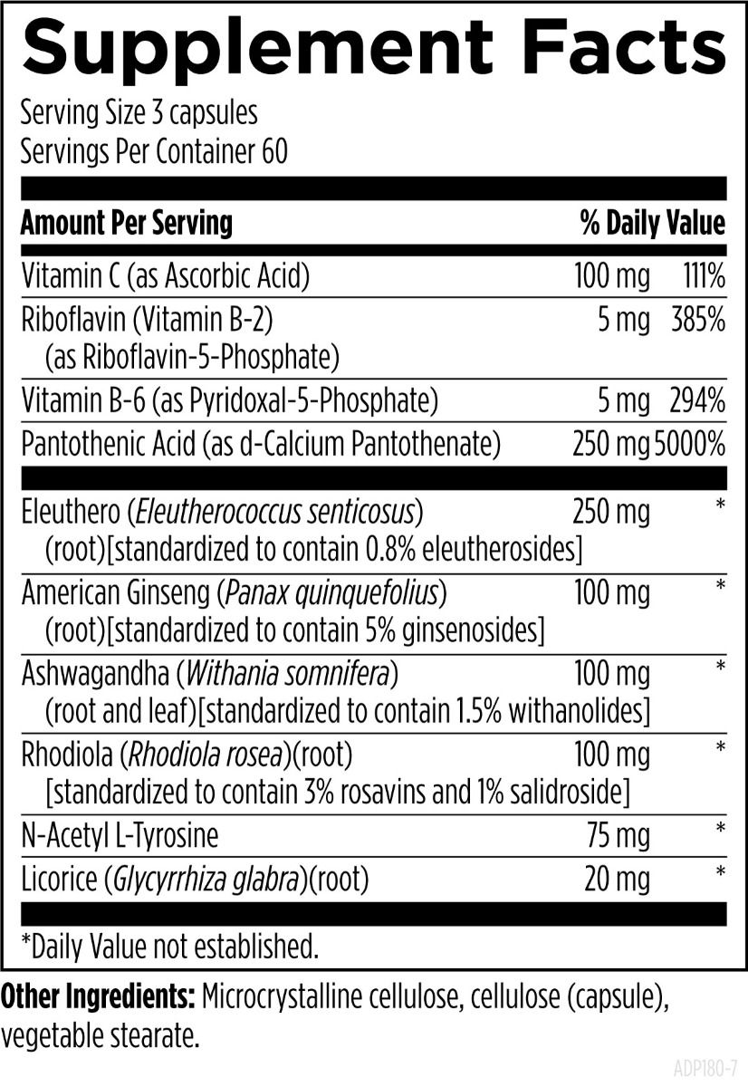 Adrenotone™ is a combination of standardized adaptogenic herbs and nutrients that are known to contribute to rejuvenating the adrenals. This product is designed to help support healthy cortisol metabolism, hypothalamic and pituitary function (HPTA axis), and catecholamine production (dopamine, norepinephrine, and epinephrine).*